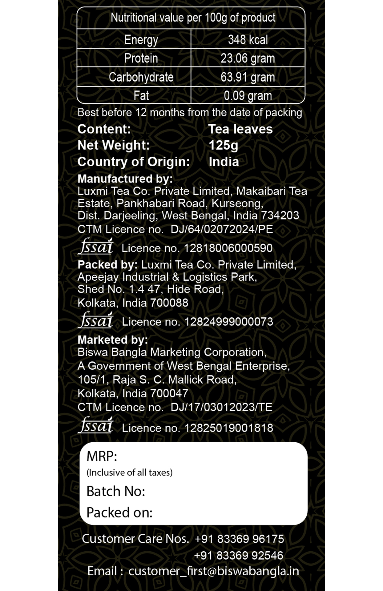 125g each 2 Leaves No added flavours Darjeeling Yes Mono Carton Tea Box 12 Months |