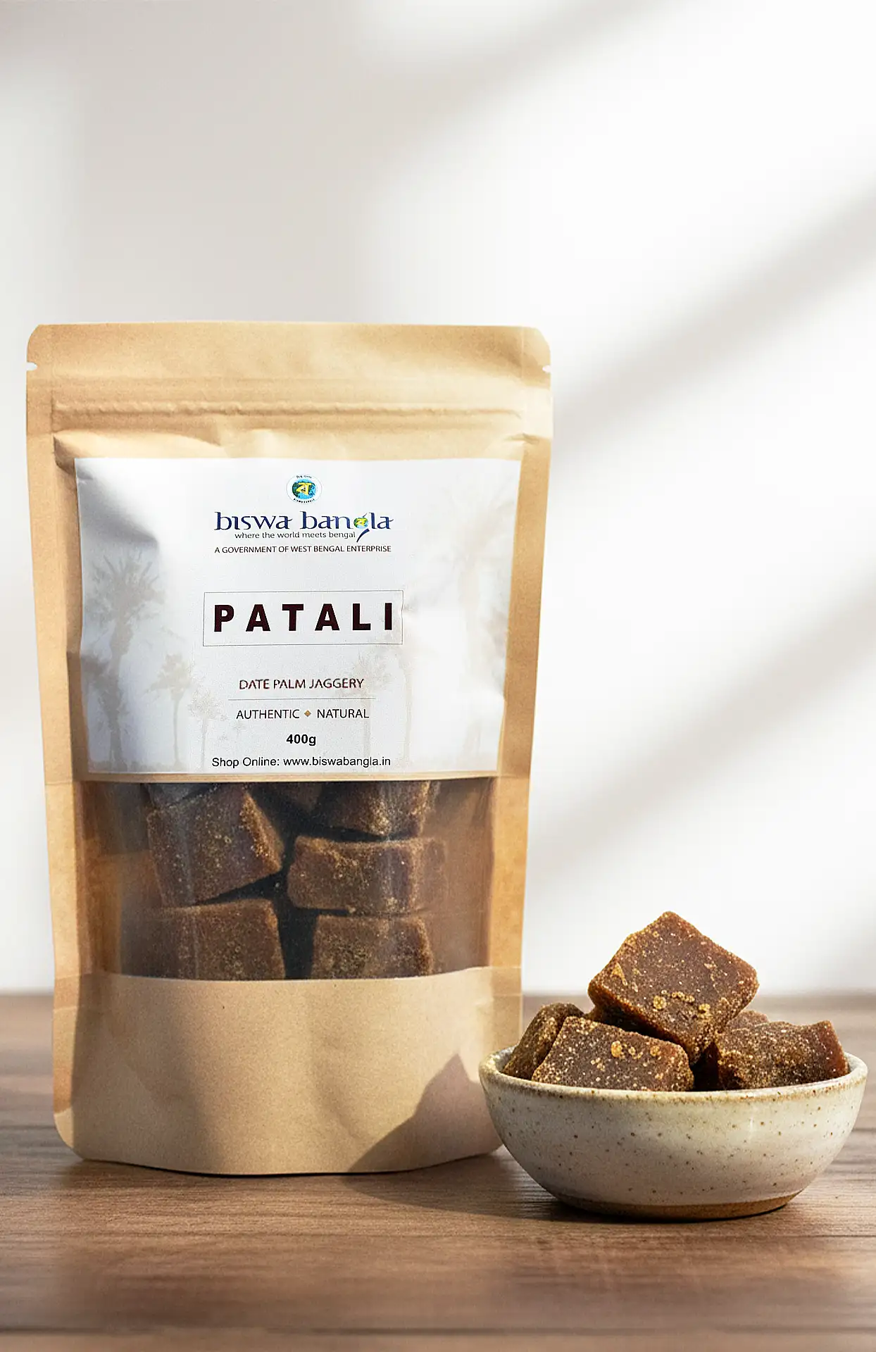 Patali Gur (Solid Natural Date Palm Jaggery) is one of the most widely admired winter delicacies of Bengal. Biswa Bangla, a Government of West Bengal enterprise. presents this authentic Nalen Gur produced by the traditional farmers and artisans of Bankura in collaboration with Earth Story Farms, a social enterprise committed to promoting sustainable farming practices and an unadulterated farm-to-table experience devoid of artificial preservatives and chemicals.
