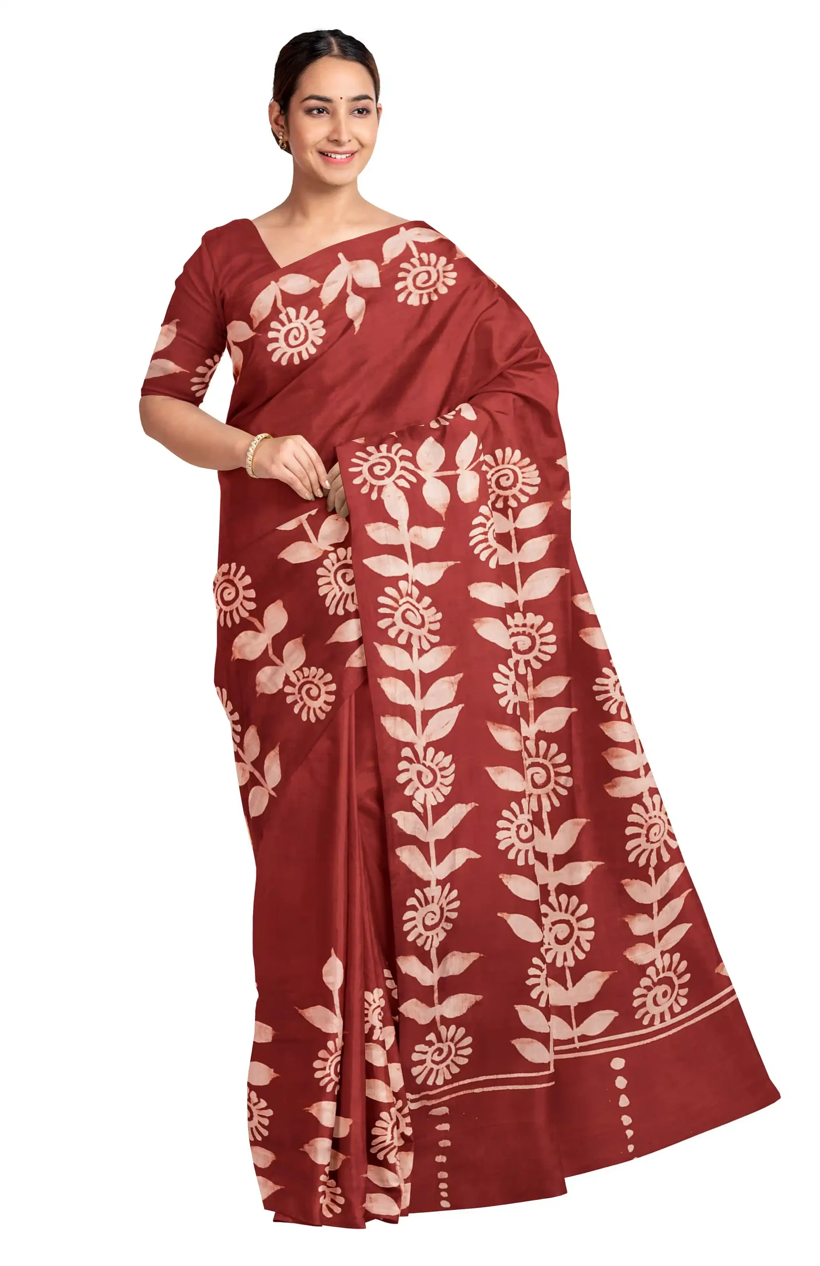 Today, batik prints can be found on sarees, dupattas and wall hangings, dresses, bags, accessories and home furnishing. Biswa Bangla is creating contemporary designs in vibrant colours on batik with the young women of Birbhum work in as members of Self-Help Groups. An artisan takes around 2-4 days to create a batik saree.
