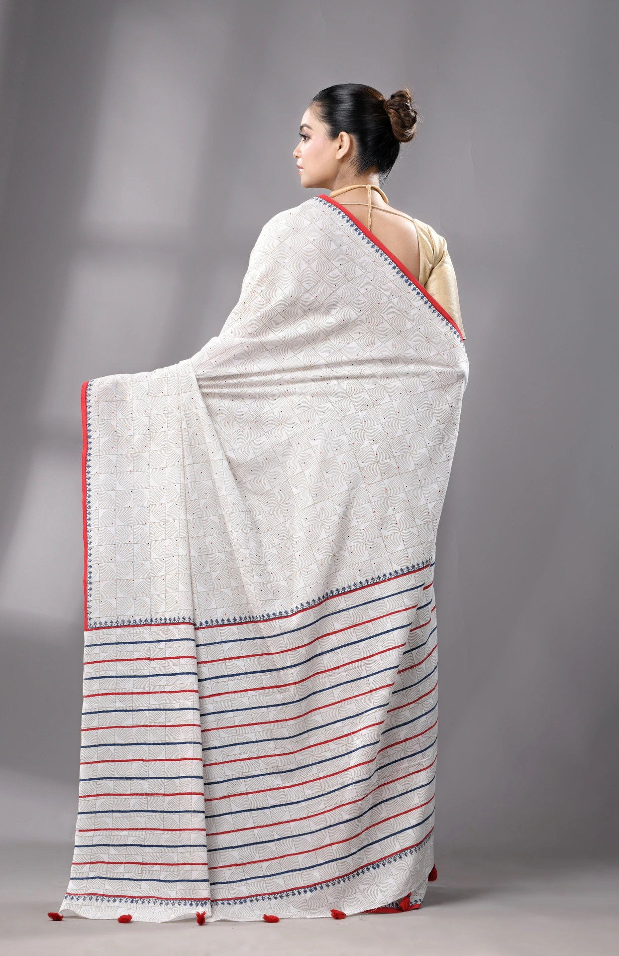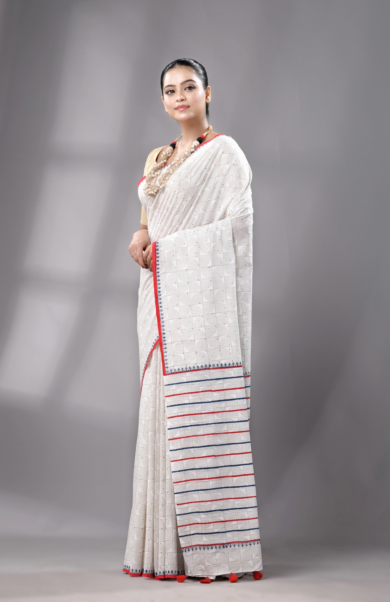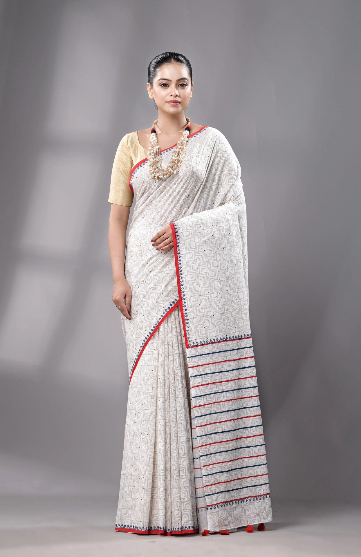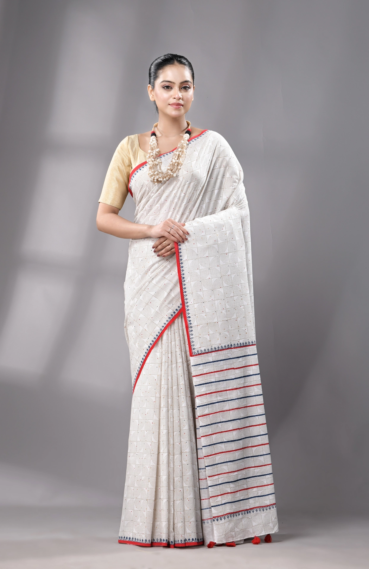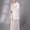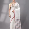 Block Printed Handwoven Muslin Cotton Saree – White