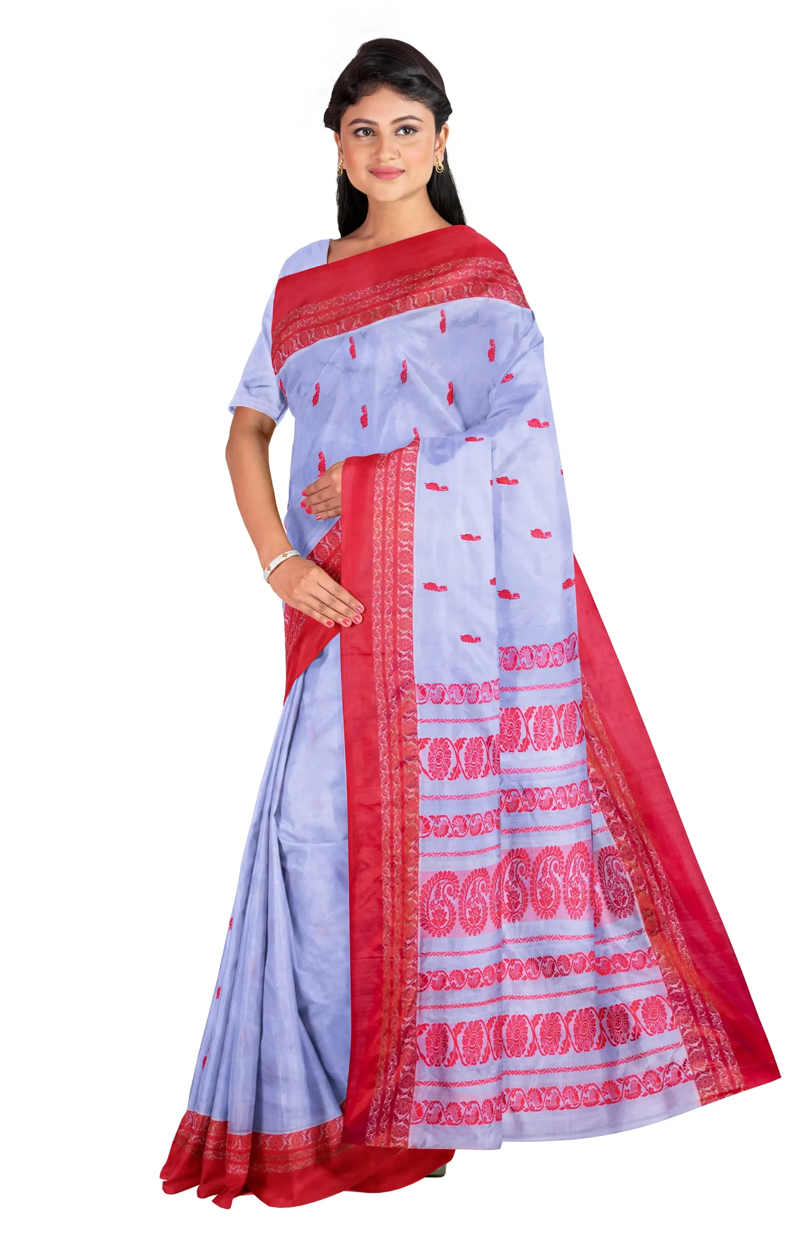Garod is literally a variety of silk. Bengal’s quintessential Garod saree is characterised by plain red borders set against a smooth natural ground with widely spaced motifs (generally paisleys) scattered diagonally from feet to waist. Women of Bengal prefer Garod sarees during the pujas. A weaver takes around 4-5 days to produce an exquisite Garod saree.