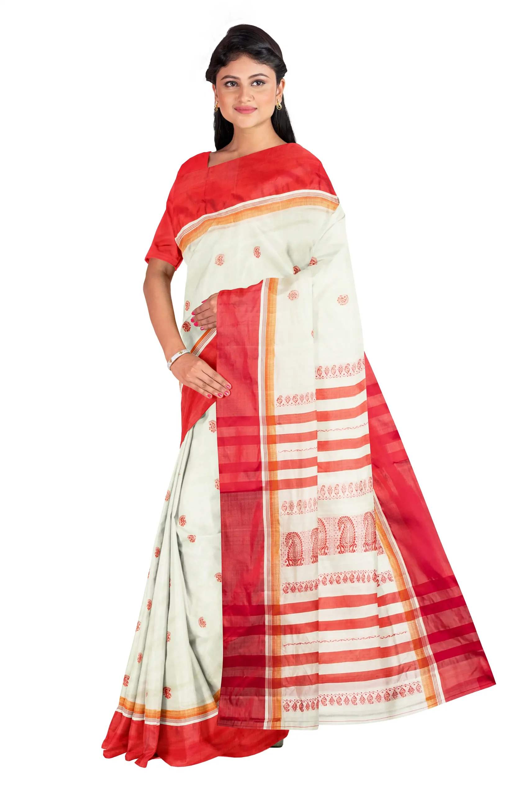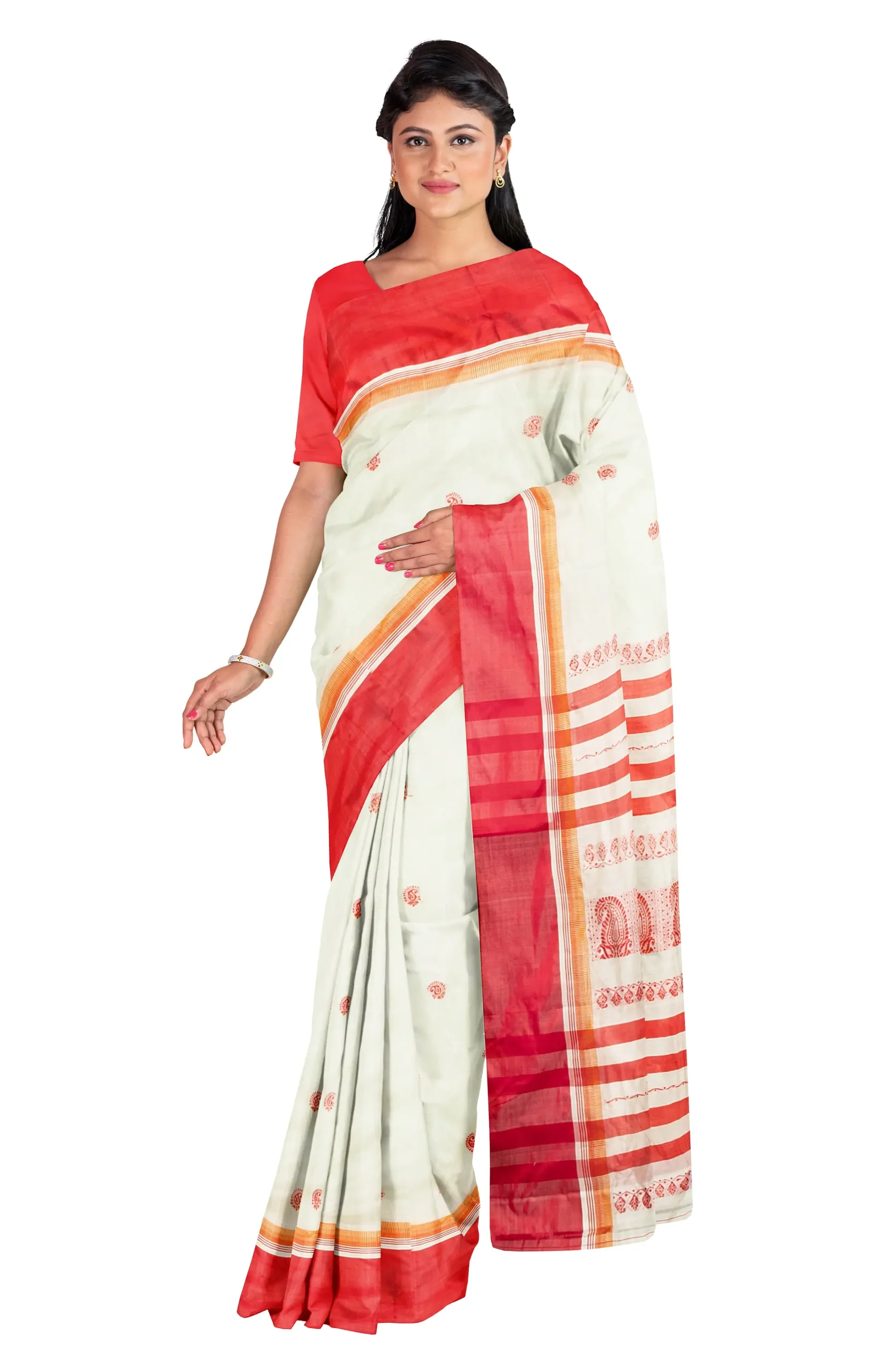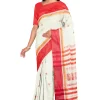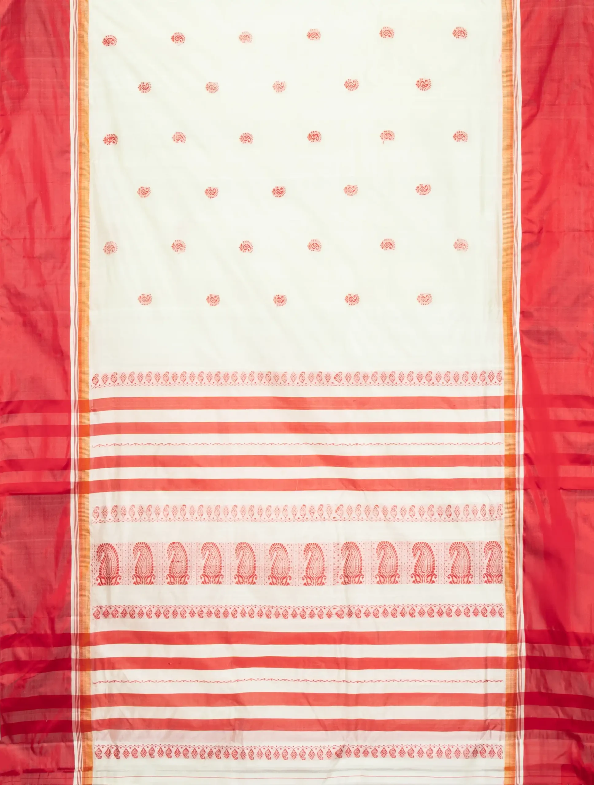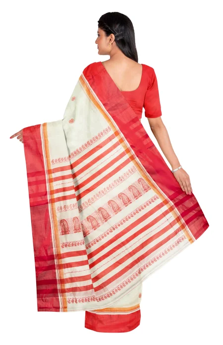 Garod is literally a variety of silk. Bengal’s quintessential Garod saree is characterised by plain red borders set against a smooth natural ground with widely spaced motifs (generally paisleys) scattered diagonally from feet to waist. Women of Bengal prefer Garod sarees during the pujas. A weaver takes around 4-5 days to produce an exquisite Garod saree.