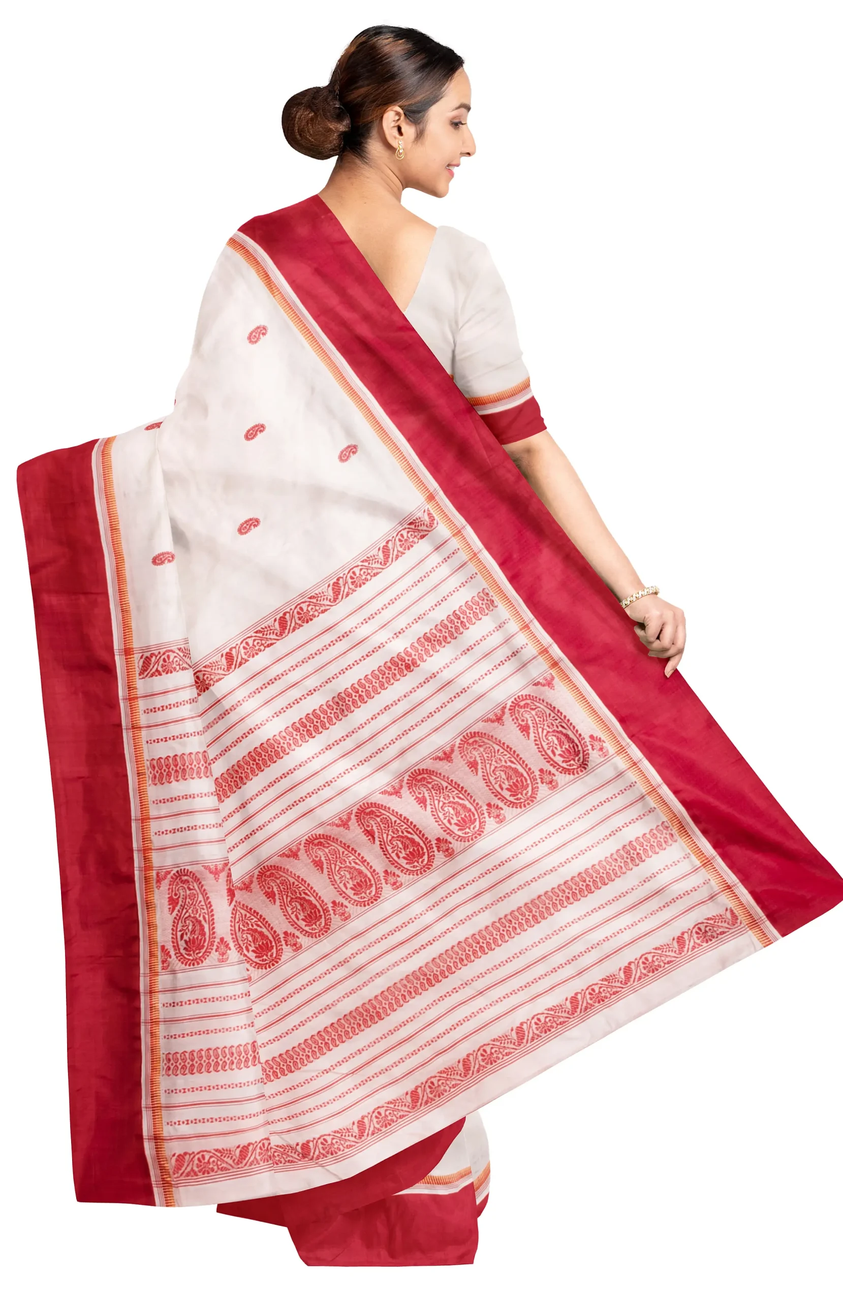 Garod is literally a variety of silk. Bengal’s quintessential Garod saree is characterised by plain red borders set against a smooth natural ground with widely spaced motifs (generally paisleys) scattered diagonally from feet to waist. Women of Bengal prefer Garod sarees during the pujas. A weaver takes around 4-5 days to produce an exquisite Garod saree.
