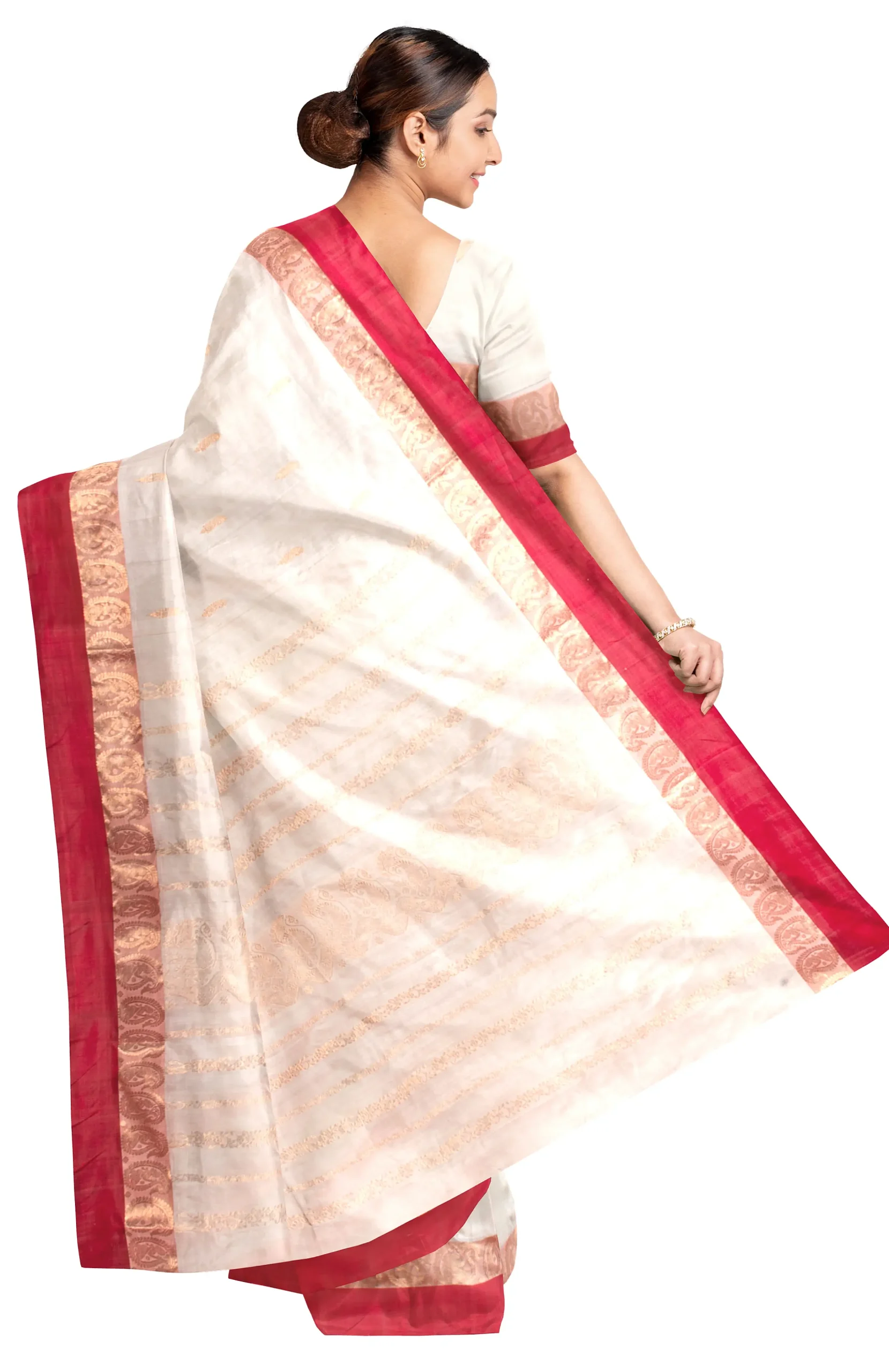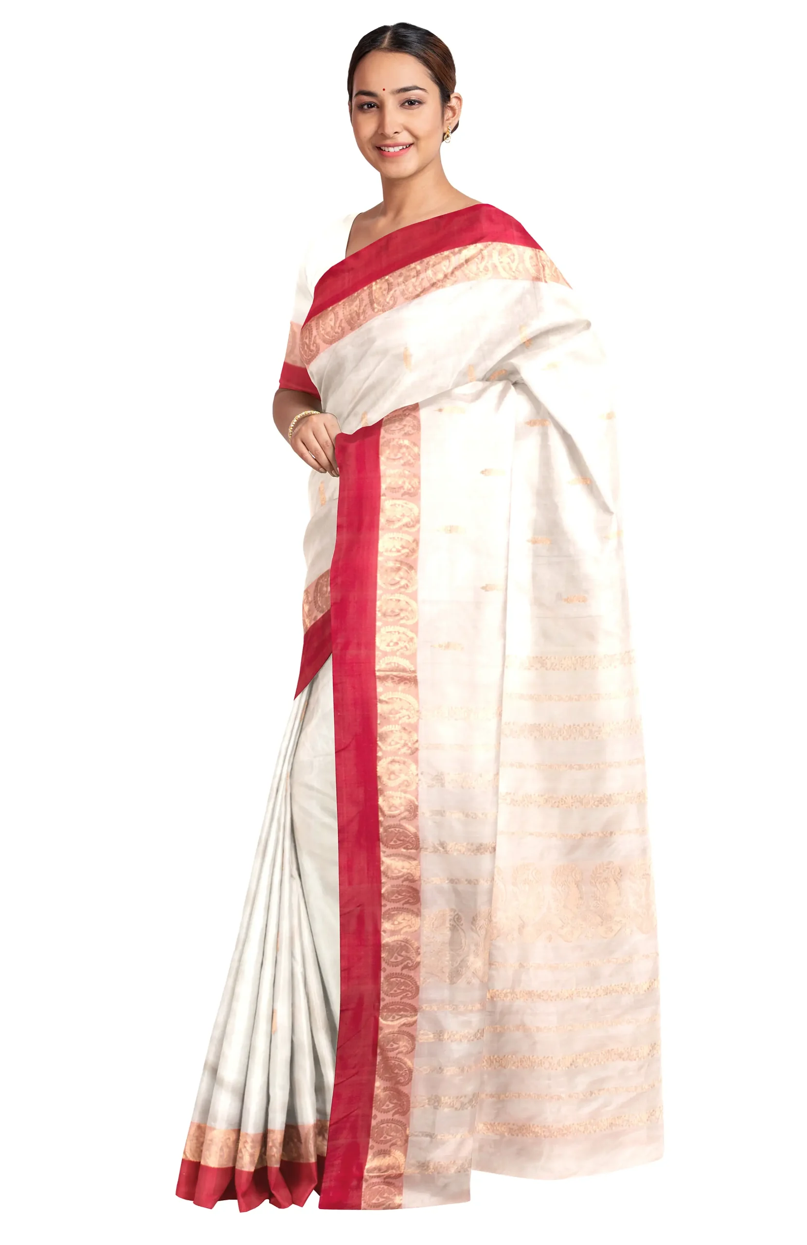 Garod is literally a variety of silk. Bengal’s quintessential Garod saree is characterised by plain red borders set against a smooth natural ground with widely spaced motifs (generally paisleys) scattered diagonally from feet to waist. Women of Bengal prefer Garod sarees during the pujas. A weaver takes around 4-5 days to produce an exquisite Garod saree.