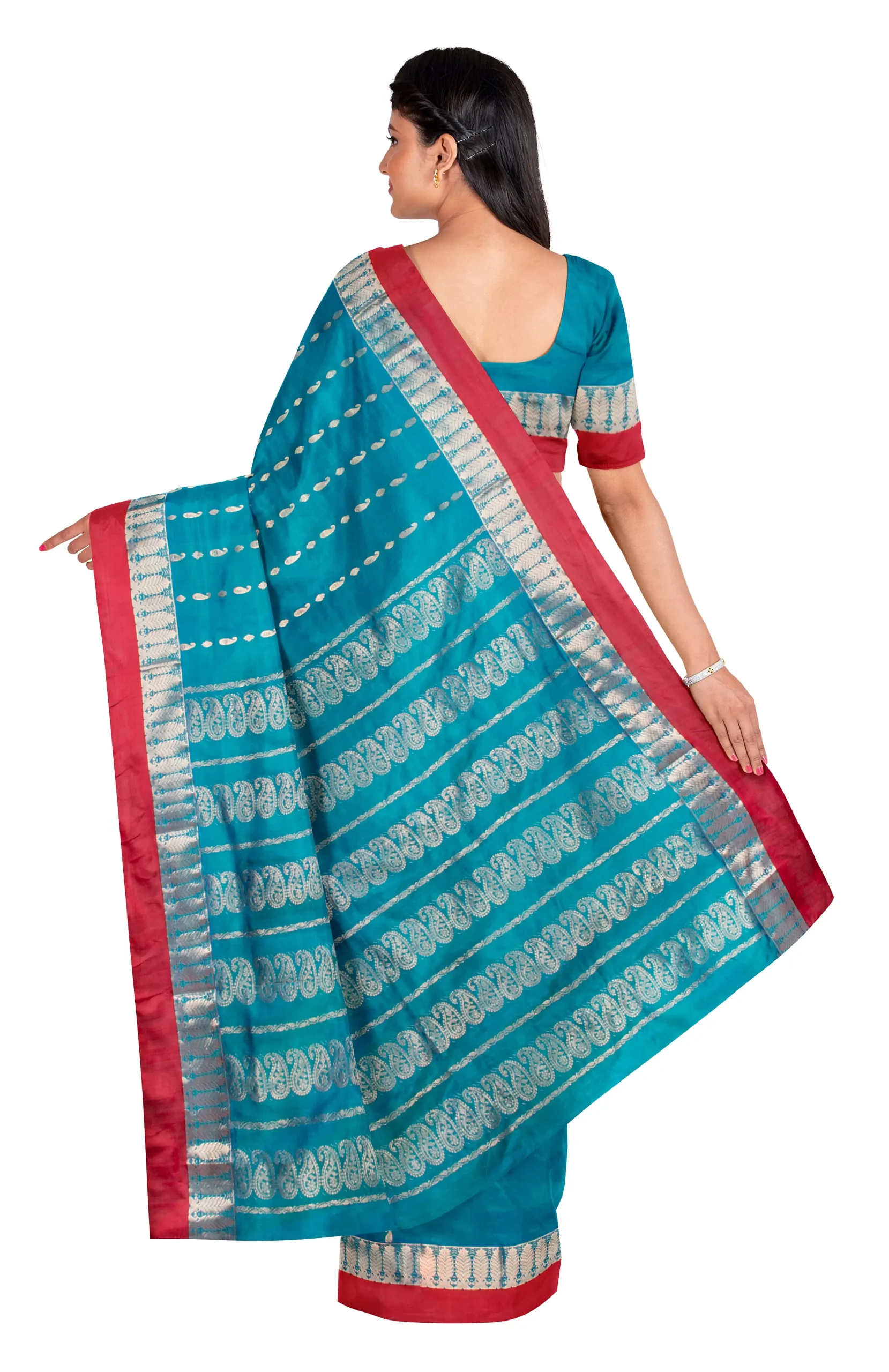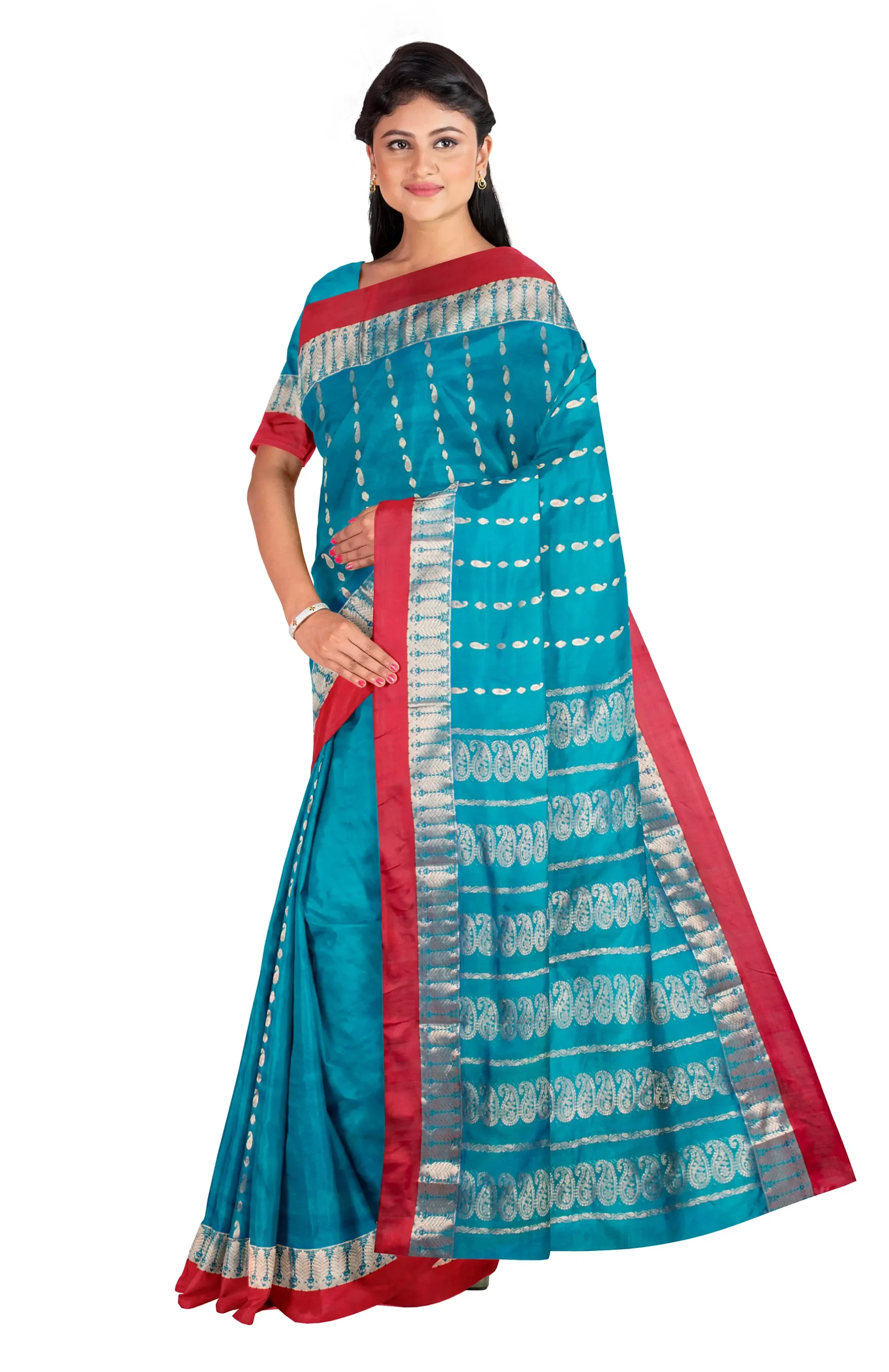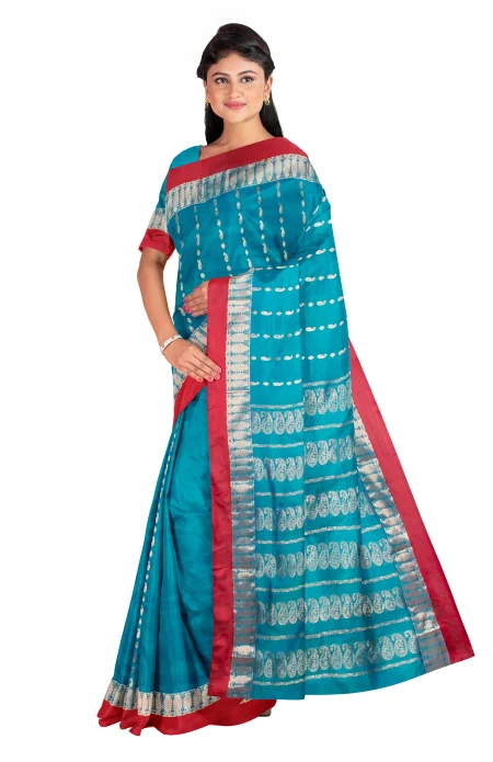 Garod is literally a variety of silk. Bengal’s quintessential Garod saree is characterised by plain red borders set against a smooth natural ground with widely spaced motifs (generally paisleys) scattered diagonally from feet to waist. Women of Bengal prefer Garod sarees during the pujas. A weaver takes around 4-5 days to produce an exquisite Garod saree.