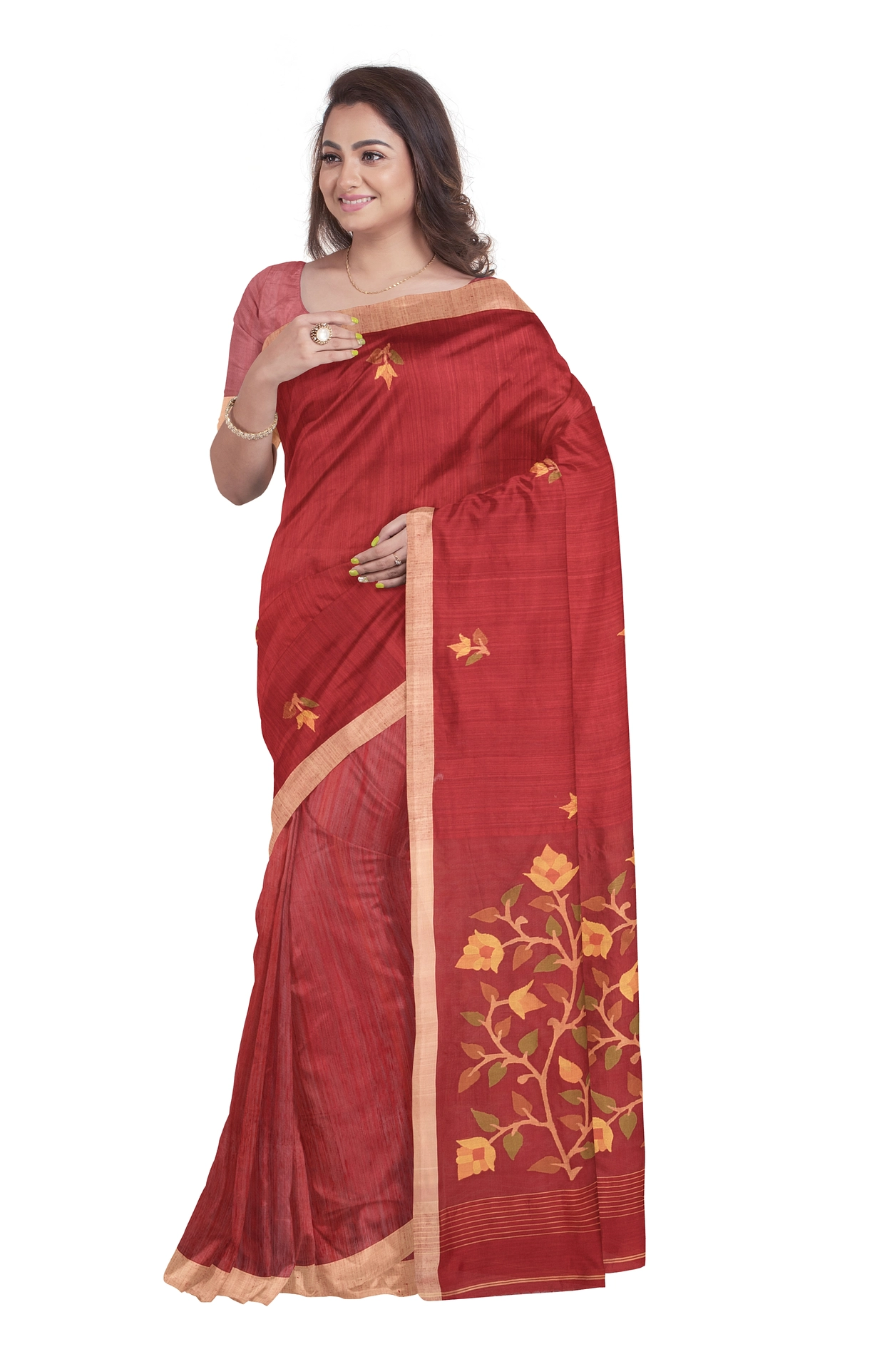 Originally made from Karpas cotton grown in the Brahmaputra hinterland, Jamdani at present is worked on cotton, cotton-silk and pure mulberry silk. The weaving of jamdani is like tapestry work where small shuttles of coloured, gold or silver threads are passed through the weft. It’s the vibrant colours and richness of its motifs that make Jamdani stand out from among other handloom products. Handweaving Jamdani is time-consuming and labour-intensive because the motifs are created directly on the loom using the discontinuous weft technique. A highly skilled weaver takes almost eight to twelve months to weave an exquisite Jamdani saree.