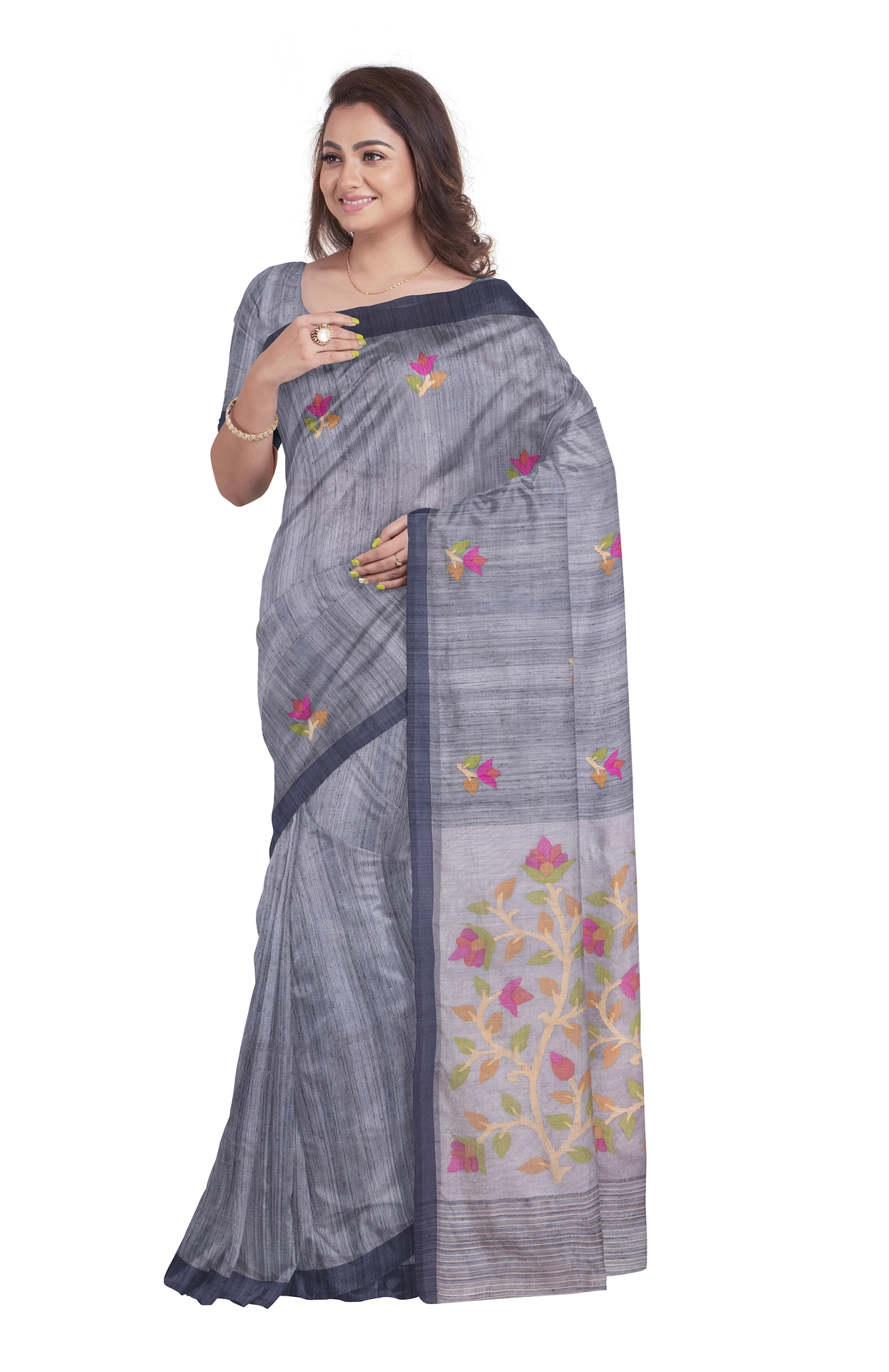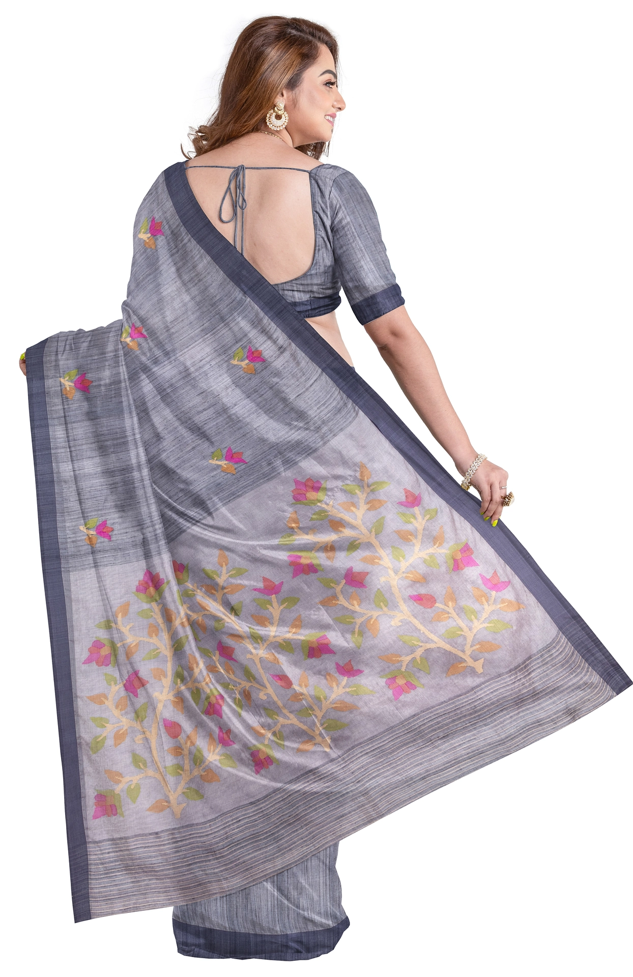 Originally made from Karpas cotton grown in the Brahmaputra hinterland, Jamdani at present is worked on cotton, cotton-silk and pure mulberry silk. The weaving of jamdani is like tapestry work where small shuttles of coloured, gold or silver threads are passed through the weft. It’s the vibrant colours and richness of its motifs that make Jamdani stand out from among other handloom products. Handweaving Jamdani is time-consuming and labour-intensive because the motifs are created directly on the loom using the discontinuous weft technique. A highly skilled weaver takes almost eight to twelve months to weave an exquisite Jamdani saree.