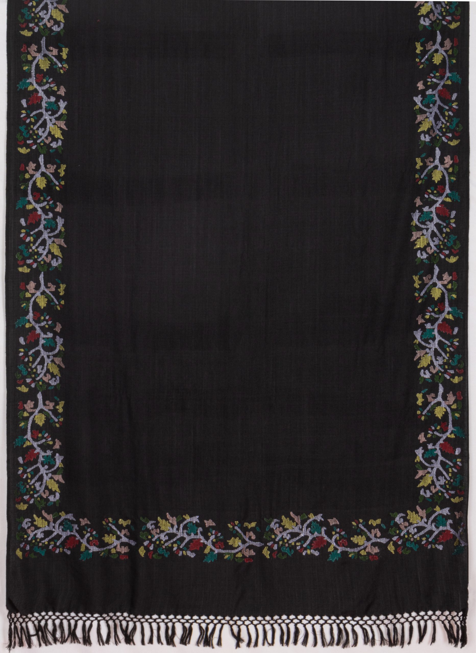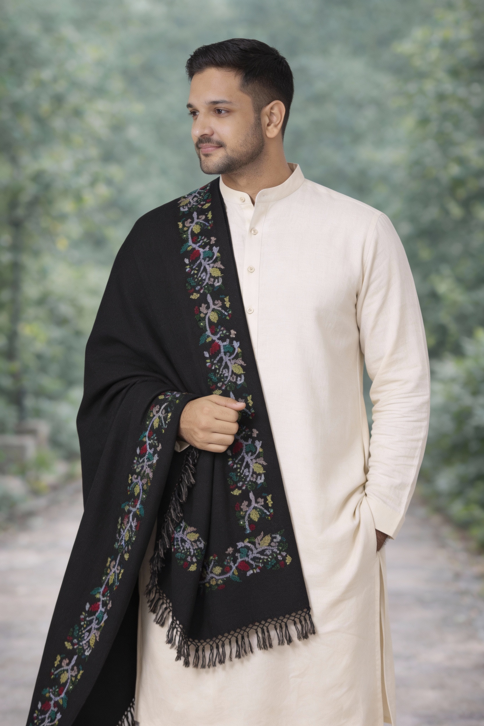 In Bengal, shawls were in fashion since the early 17th century. The most prized woven shawls were figurative and made on the complex Naksha loom. Square shawls with elaborate borders and konia kalka, the corner mango pattern which imitated the Kashmiri shawls, were traditionally woven in black and white for the Bengali aristocracy. There is a mention of a pair of such shawls being woven for Maharaja Bahadur Jatindra Mohan Tagore. Biswa Bangla reintroduces the famous Jamdani Shawls that were once the pride of Bengal.