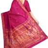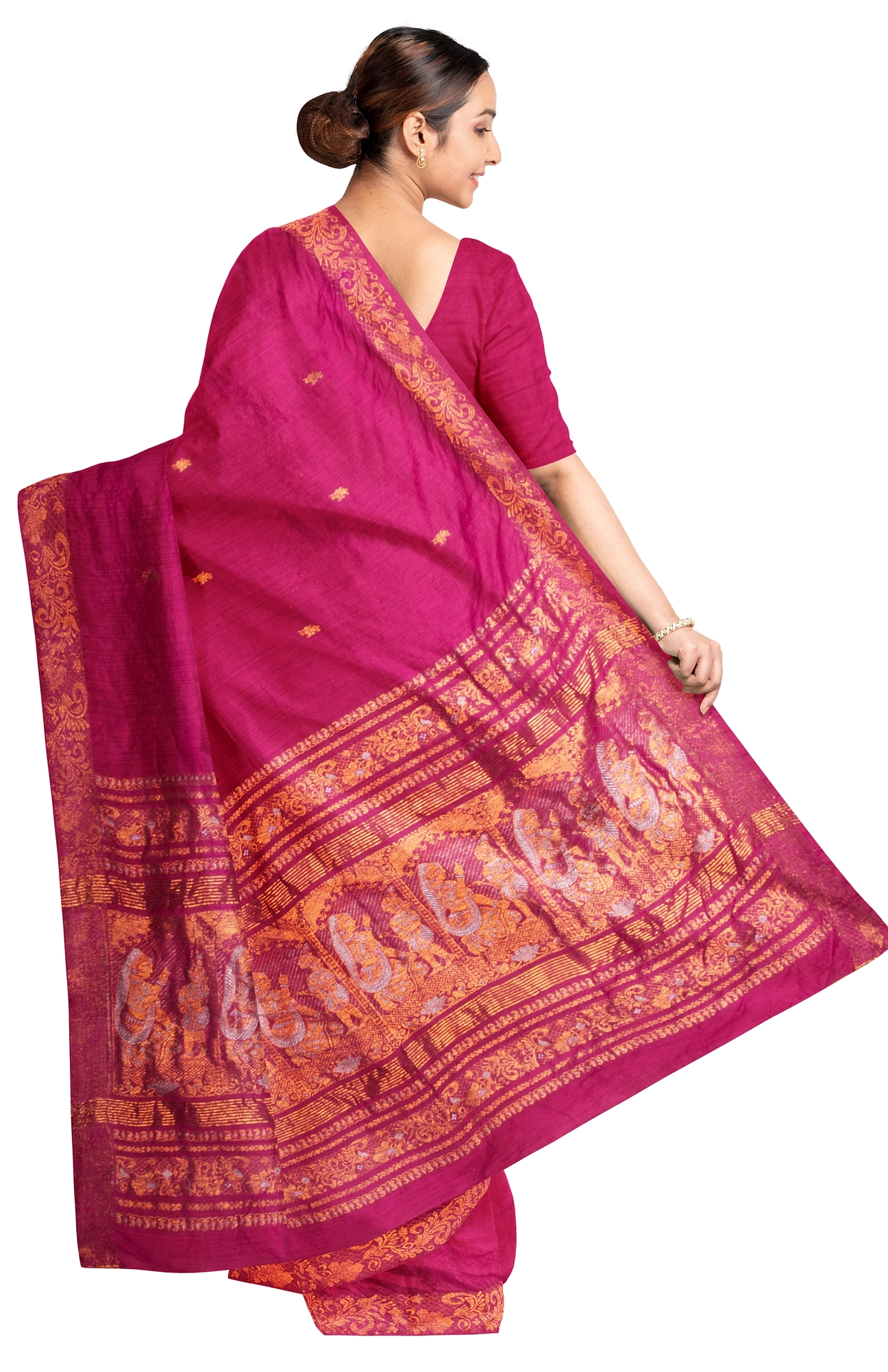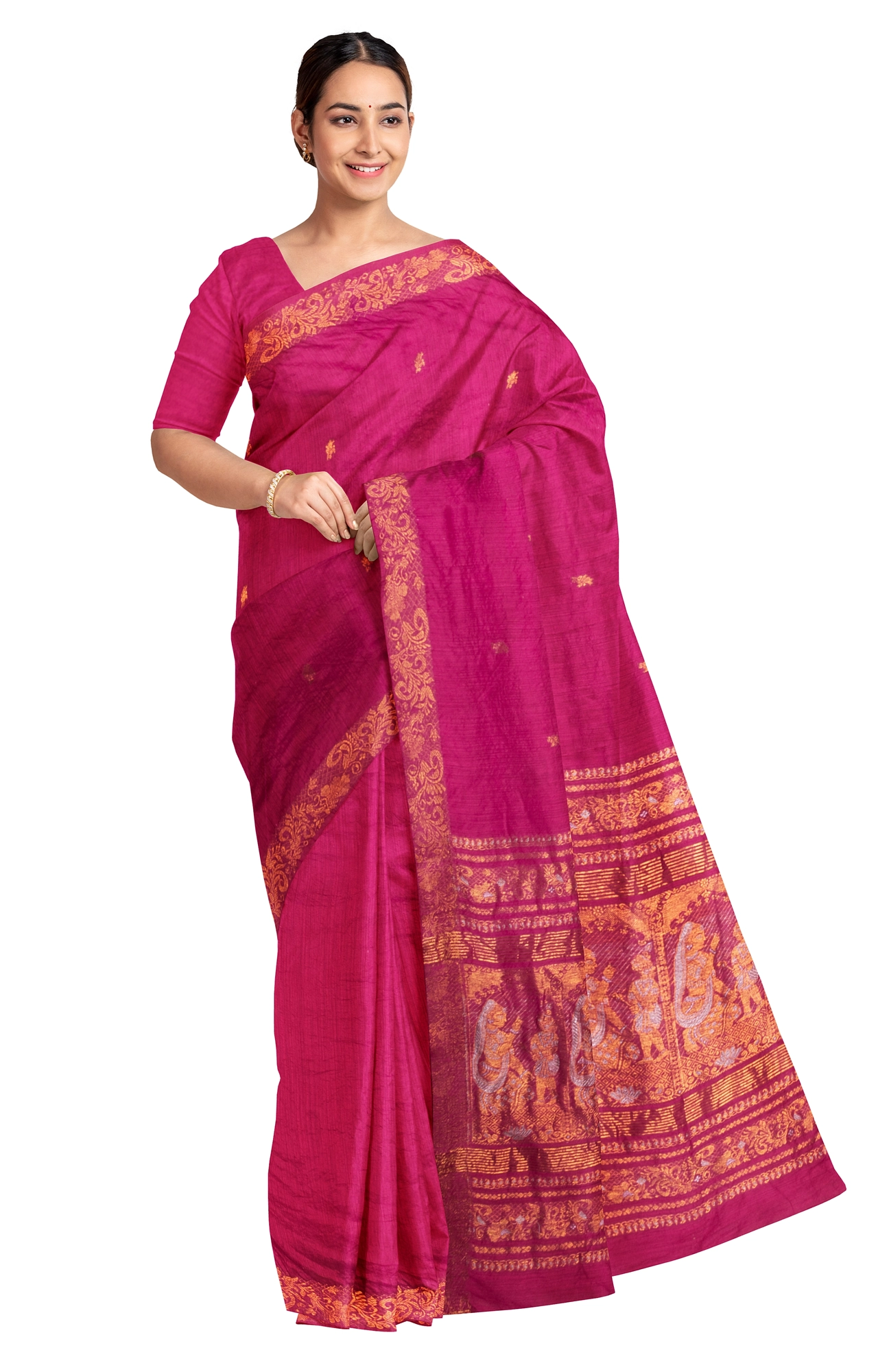 Tangail sarees are hand-woven on cotton and silk with hand-worked buti, floral design or contemporary motifs. The main characteristic of Tangail saree is the extra weft buti, tiny motifs repeated all over the ground of the saree with the help of Jacquard loom. Cotton Tangail is very popular because it is light and excellent as a daily wear. About 1,000 weavers and 2,000 ancillary artisans, largely in Nadia and some in Bardhaman district are producing these colourful, easy-to-manage, uniquely elegant cotton sarees.